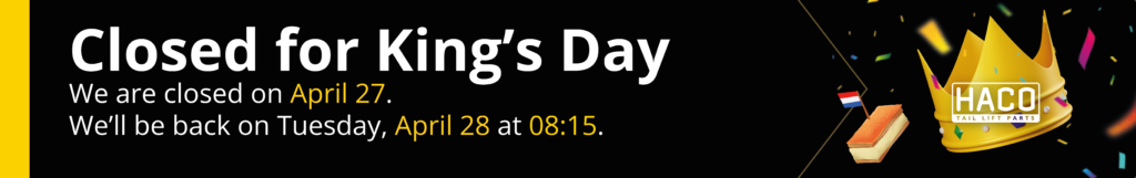 HACO stands for high-quality products, excellent service, and a wide range of tail lift parts. As the market leader in Europe, we supply replacement parts for all brands of tail lifts. With almost 40 years of experience, we aim to provide our customers with reliable products and personalized support.